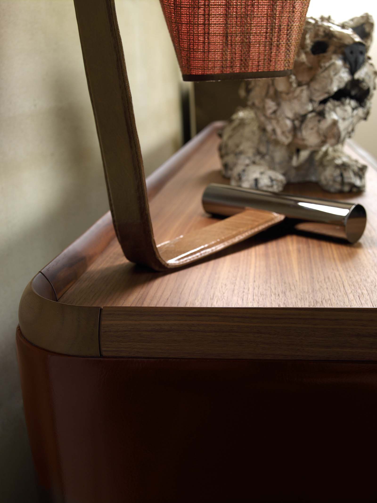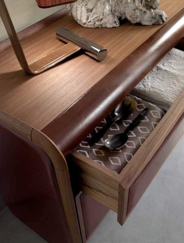 Infinity TV stand from Italian manufacturer Ulivi. Model made of solid spruce. Trim - leather from the collection company and walnut veneer. Dresser with spacious drawers. The model is in modern style . Perfect choice for living room, hallway or dining room in contemporary style.
