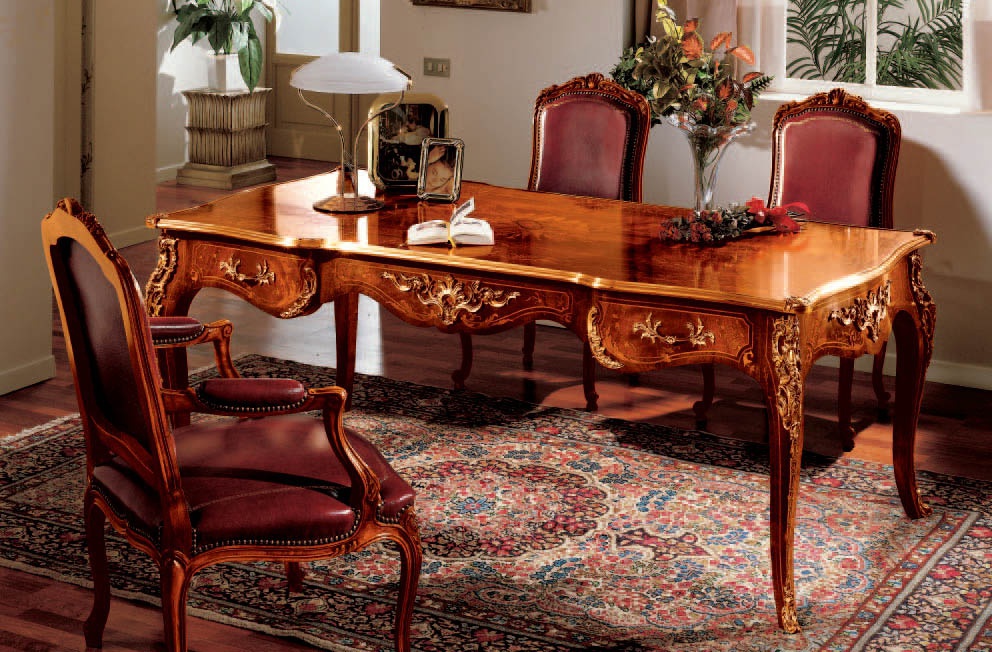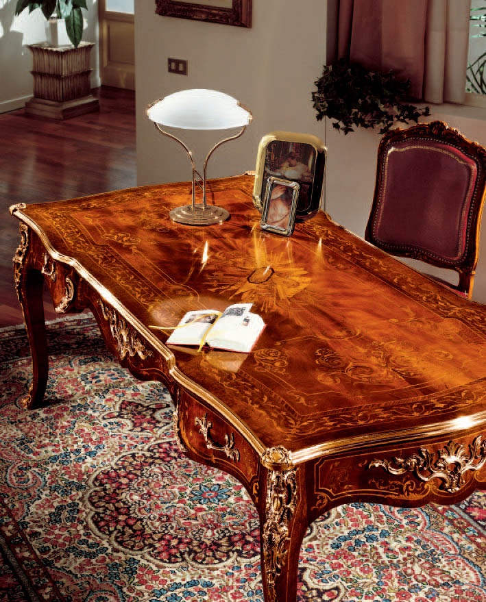 Desk from Italian producer Armando Rho. Model in classic style, made from solid wood with subtle accents of cherry tree. Carved items - handmade. Finishing - varnish, antique gold. Colours in stock.