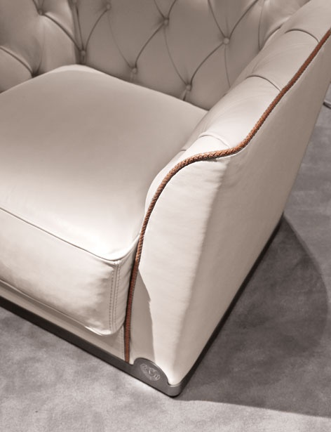 stiffness. Seat cushion filled with sterilized goose down, has an insert of foamed polyurethane in different hardness and special reinforced packing material "Visco Soft", characterized by softness and high durability. Inner back has a finish Capito buttons in upholstery color or with crystals "Swarovski". The chair may have a rim of braided leather manufacturing thin. Due to special handling padding frame leather and fabric not removable. In the base of the chair is metal with laser engraved logo, which has