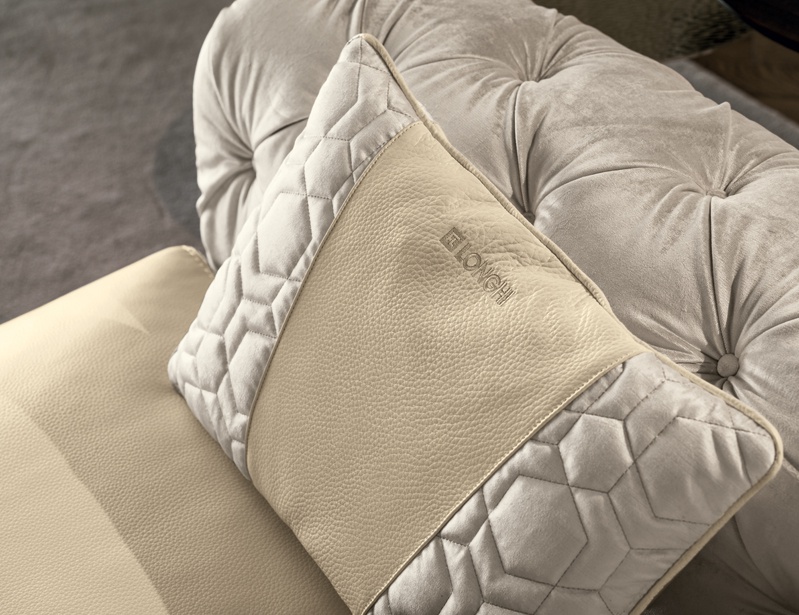 Milton three seater sofa from Italian manufacturer Longhi. Wooden frame with elastic belts covered with polyurethane foam high density. Backrest cover part and the armrest has a trim Capito with monochrome buttons or with crystals “Swarovski”. The base pad with a smooth upholstery polyurethane foam triple density covered with soft case filled with sterilized goose down. At the base of the sofa is metal with the following finishes: glossy chrome,