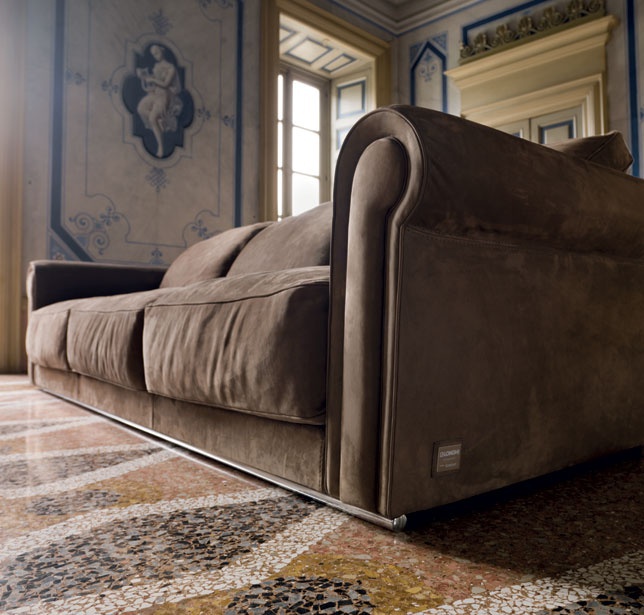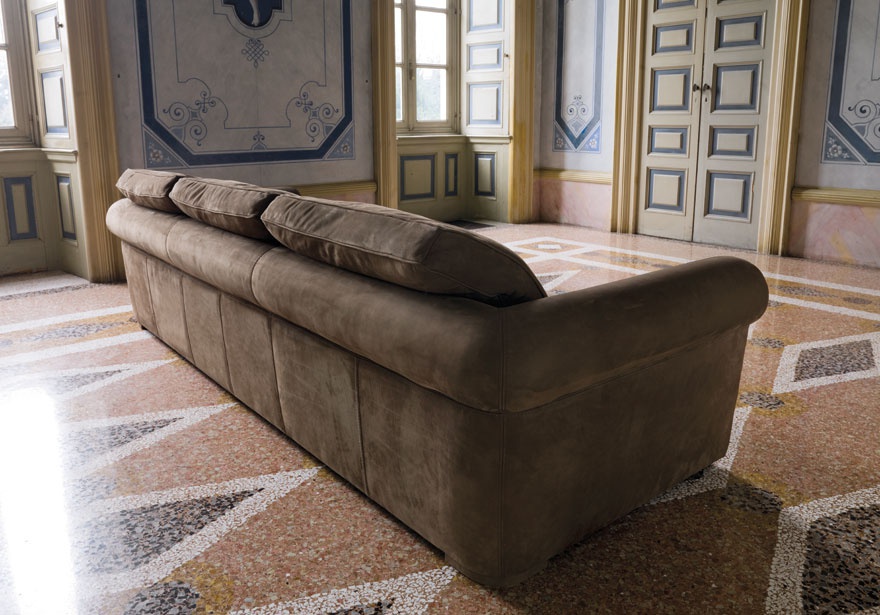 Paul three seater sofa from Italian manufacturer Longhi. Wooden frame with elastic straps, covered with polyurethane foam of high density and various thicknesses. The cushions filled with sterilized goose down, have the insert of foam polyurethane of various thickness, fortified with a special padded material "Visco Soft", providing more comfort and longer service life. Back cushions filled with sterilized goose down, have a box of soft polyurethane foam to ensure greater comfort. Front base in aluminium with glossy finish or painted in bronze. Back legs covered with the same material as the upholstery.