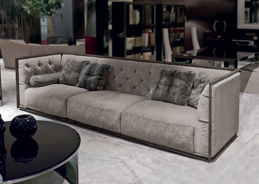 which is characterized by softness and high durability. Frame around the perimeter made by hand, for sofas, fully upholstered in fabric, perhaps a combination of leather fringing. The backs are finished Capito buttons in upholstery color or with crystals "Swarovski". Base frame made of aluminium tubes with a high gloss finish or painted in bronze. Due to special handling padding frame as