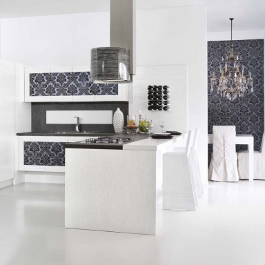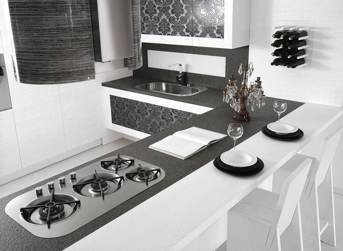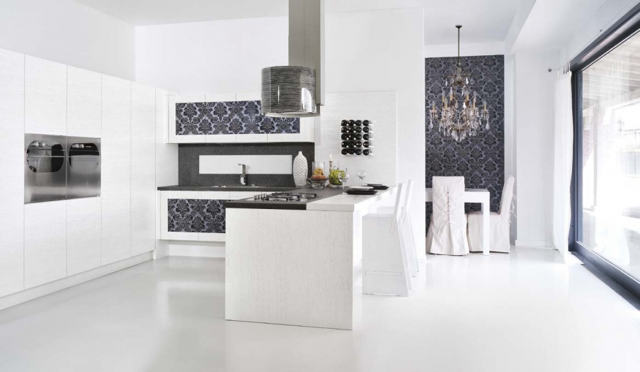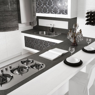 Set for kitchen Creators of Emotions from the Italian manufacturer MOD'...ART. Set, with elements of glamour in a contemporary style, consists of a corner of the working area, overhead cupboards and a massive wardrobe, a small bar. The body is made from solid chestnut. Marble. The facade is decorated with ceramic tiles with floral ornaments, ceramics of high strength. Colors represented the headset is built on the contrast of the white surface of the furniture and black-and-white decor. It is important to note that marble, ceramic tile and a lacquer - based on manufacturer's catalogue.