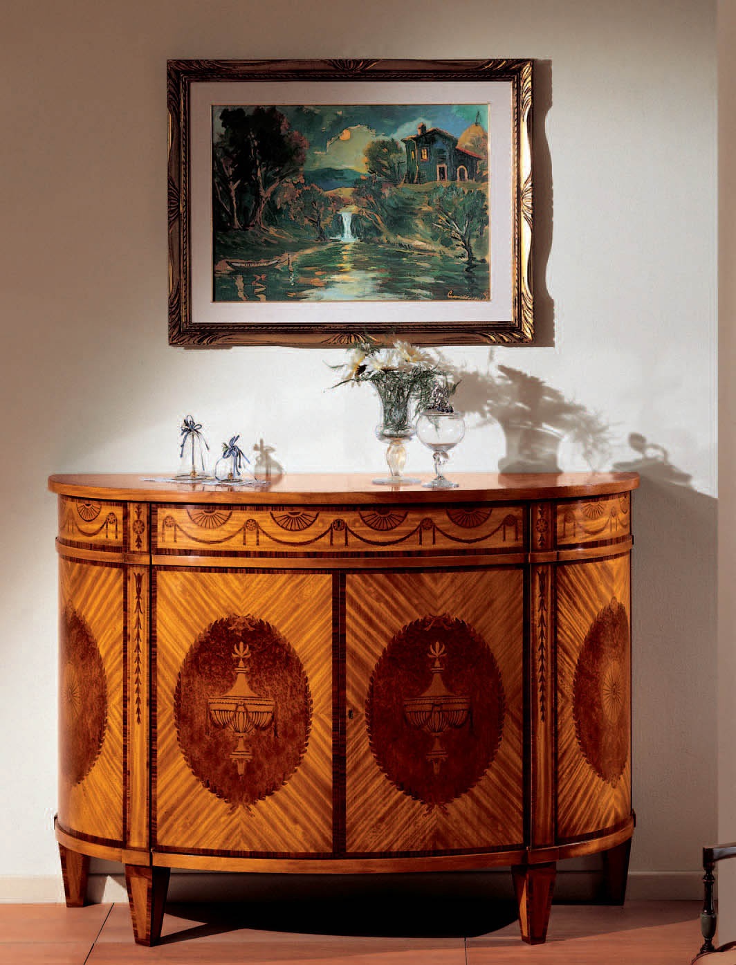 Semi-circular tables from Italian producer Armando Rho. Model in classic style, made of solid wood with elegant inlays of pear wood, walnut and maple. Carved elements - hand made in the decoration of gilding. Colours in stock.