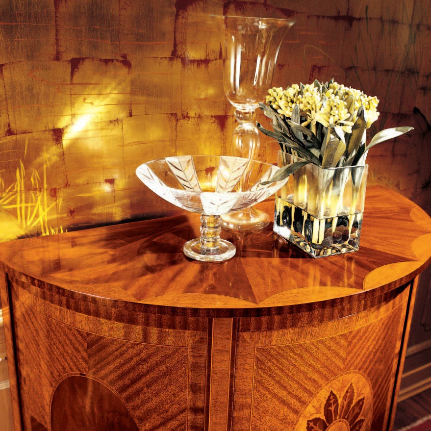 Stand from Italian manufacturer Armando Rho. Model in classic style, made from solid mahogany with elegant inlays of pear wood, maple and walnut. Carved elements - hand made in the decoration of gilding.