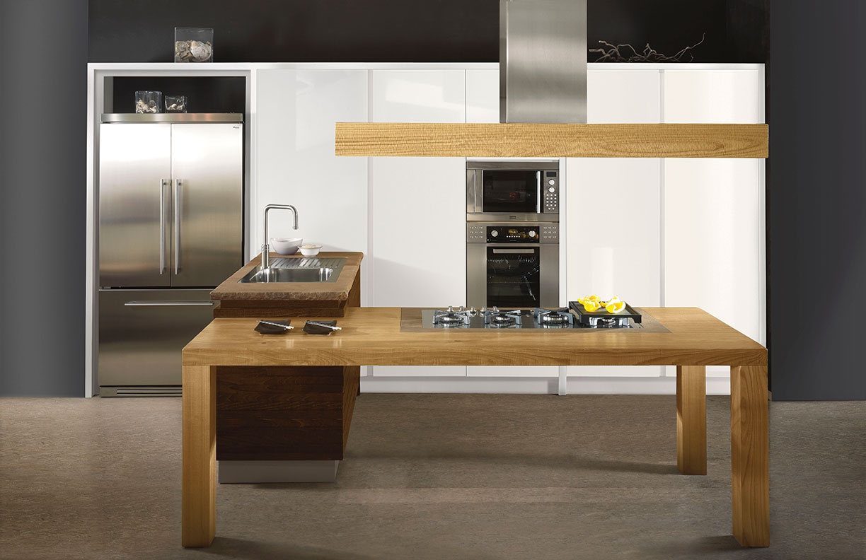 Set for kitchen Creators of Emotions from the Italian manufacturer MOD'...ART. Set in a minimalist style, consists of work surface and cooking area combined with Breakfast bar, massive Cabinet for built-in appliances, range hoods stainless steel. The building, the facades are made of solid chestnut. The bar countertop is made of antiqued Italian chestnut wood, polished with oil. The main part of the facade is transparent Matt lacquer, eco-friendly, water-based. It emphasizes the structure of wood. The surface of the working area is made of marble. Presented headset colors: natural wood, brown, steel. It is important to note that the color palette of lacquer, marble - the choice for the number of items.