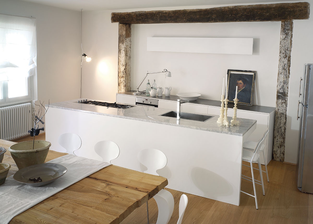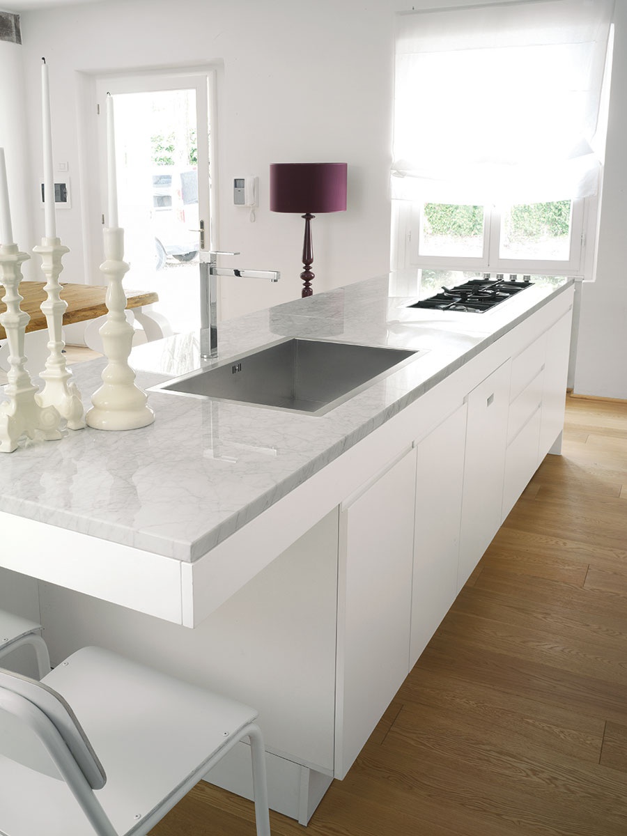 Set for kitchen Creators of Emotions from the Italian manufacturer MOD'...ART. Set combines cool minimalism with a warm atmosphere of the past. Consists of working area, island with cooktop, dining table. The building, the facades are made of solid chestnut. Work areas - made of white Carrara marble and steel. The main part of the facade painted white, high gloss finish, eco-friendly, water-based. Top dining table made from antique Italian chestnut, oiled. Presented headset colors: natural wood, white. It should be noted that the varnish, marble - the choice for the number of items.