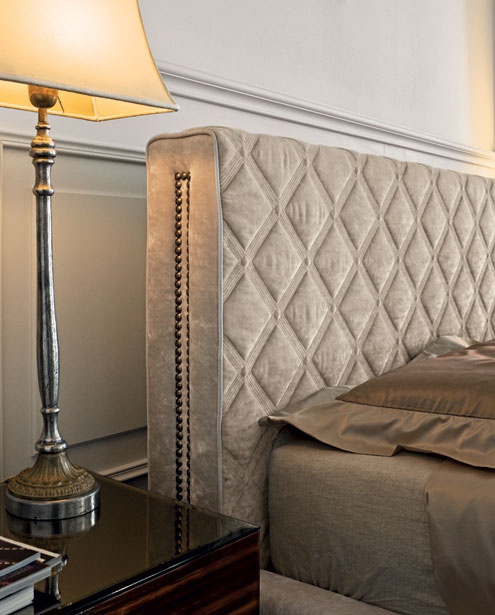 Helmut double bed bed from Italian manufacturer Longhi. Wooden headboard covered with polyurethane foam high density. Upholstery headboard decorated with stitching in a diamond shape. Padding the back side has no firmware. In the version with leather upholstered back upholstered in velvet to match. Rivets on the side of the headboard are upholstered in tone or made of metal with the following finishes: black, glossy chrome or gold. Wooden base covered with polyurethane foam high density. The base is assembled through metal angular profiles for easy installation and the ability to adjust the height of the fence, lowering it by 10 cm relative to the edge of the bed with a step of 2 cm. This allows you to use bars of any type or to change the height of the surface of the mattress. Due to the special processing of upholstery leather and fabric not removable.
