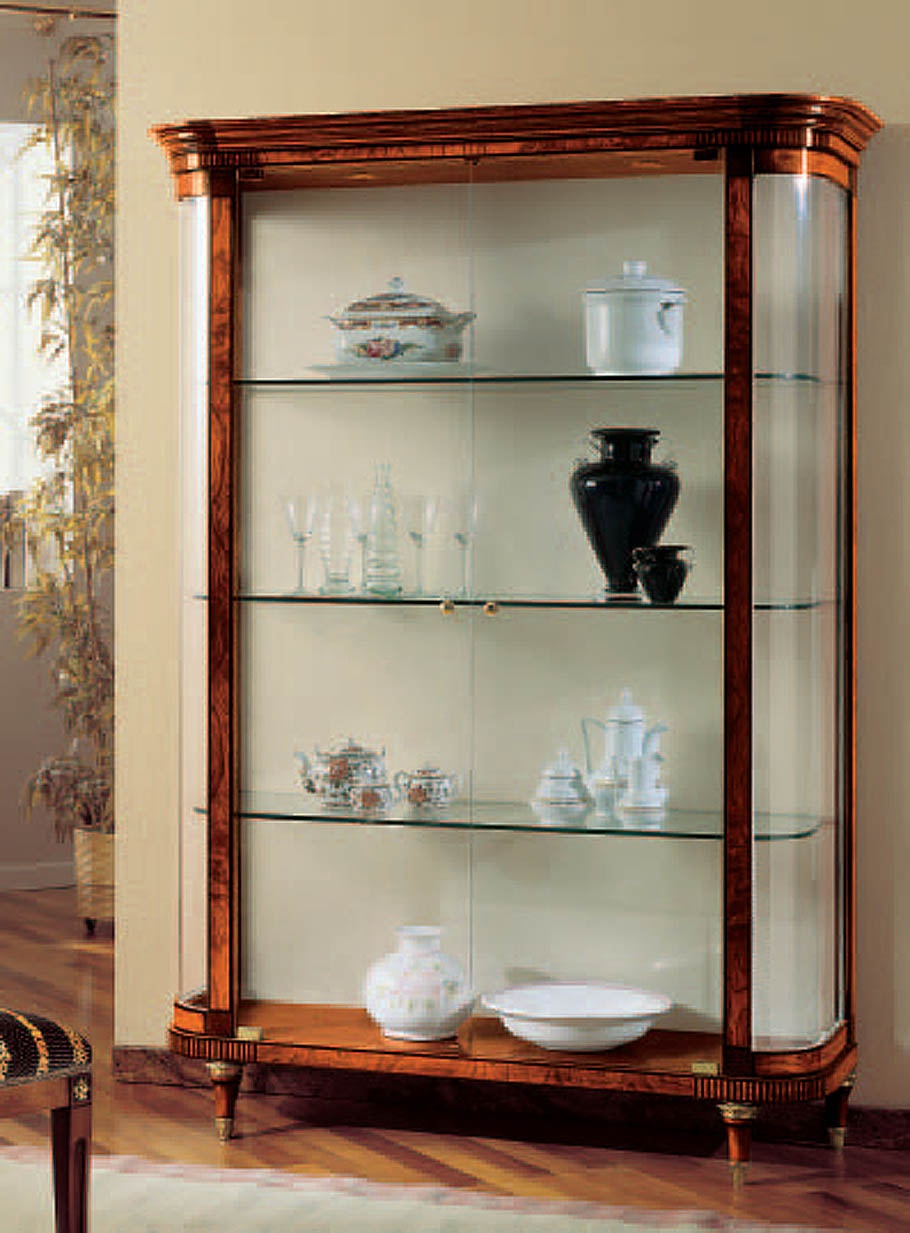 Showcase from Italian producer Armando Rho. Model in classic style, made of solid wood with delicate inlays of pear wood, walnut and maple. Finish - lacquer, gilding. Shelves - glass. Colours in stock.