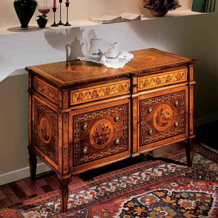 A chest of drawers from the Italian producer Armando Rho. The model is solid mahogany wood with delicate inlays of pear wood, maple, walnut and Tulip tree. Carved elements - hand made in the decoration of gilding. Colours in stock.