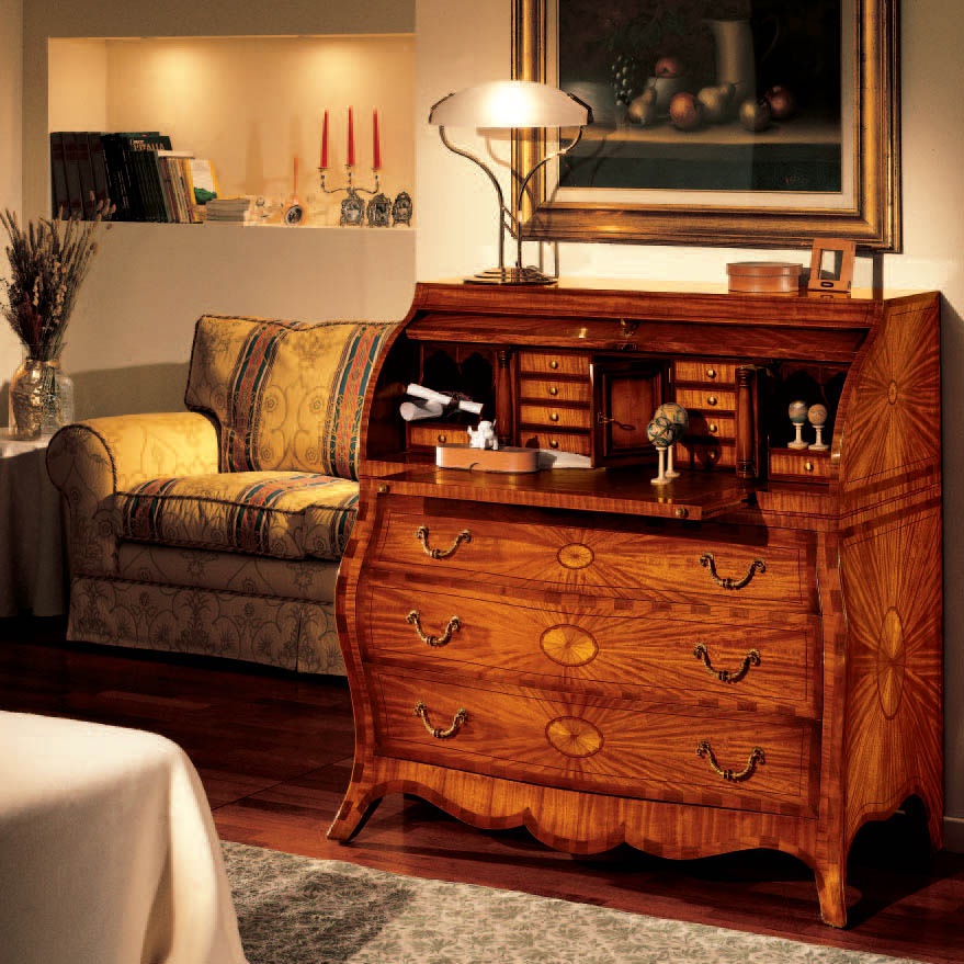 Bureau from Italian producer Armando Rho. Model in classic style, made of solid mahogany wood with delicate inlays of pear wood, maple, walnut and Tulip tree. Carved items - handmade. Colours in stock.
