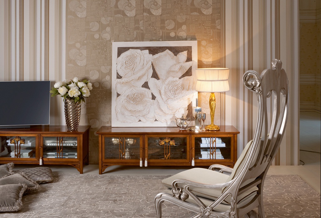 Nightstand Liberty from the Italian manufacturer Medea. The body is made of wood, door panels and glass decoration. The model is designed for the living room. Colors: natural wood color, Golden.