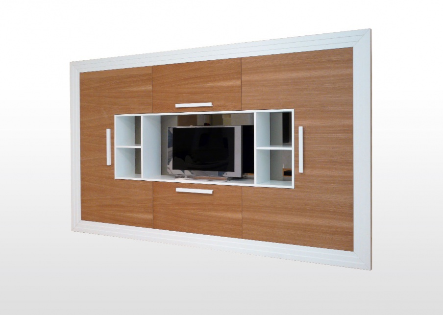 The wardrobe Design from the Italian manufacturer MOD'...ART. Made of solid wood, complemented by stainless steel fittings. The surface is treated with lacquer back in stock. Wardrobe in modern style, are equipped with niche for TV and ample storage shelves. Colors: combination of white with natural wood, you can choose the catalog of the manufacturer.