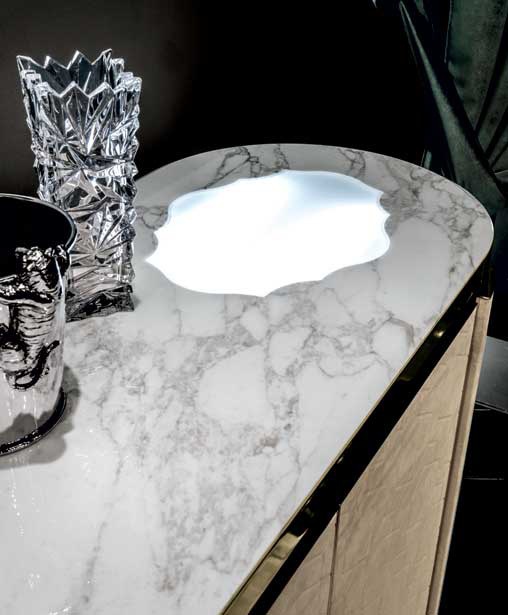 A snack bar Gordon from the Italian manufacturer Longhi. Cabinet for the living area, trimmed in leather from the company portfolio. Interior trim - Zebrano dark shade. Optional: the ability to embed only the marble surface illumination with a lamp. Trim the flaps with a three-dimensional image with relief decor “Diamond” or “Sequence” is offered only from the skin the cat. P. 3 Suede and Lusso. Surface finishes: bronze or smoky mirror 5 mm with bevel, Marble 20 mm thick with bevel mm 20: Emperador Dark marble, Silver Wave marble, Port Black marble, Frappuccino marble, Calacatta Gold marble. The base and edges of polished metal with the following finishes: glossy light gold, glossy chrome, black glossy chrome, satined bronze.