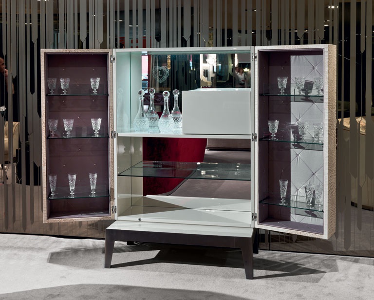 The rack bar Grandeur from the Italian manufacturer Longhi. Bar Cabinet-container with doors, outside covered by leather in colors in the catalog, inside quilted satin with buttons "Swarovski" with shelves of clear glass. Finish Cabinet-the container, and folding internal wardrobe: Matt wenge, glossy ebony, glossy Canaletto walnut or glossy ivory. The bottom panel of the Cabinet mirror with led lighting.