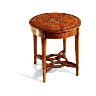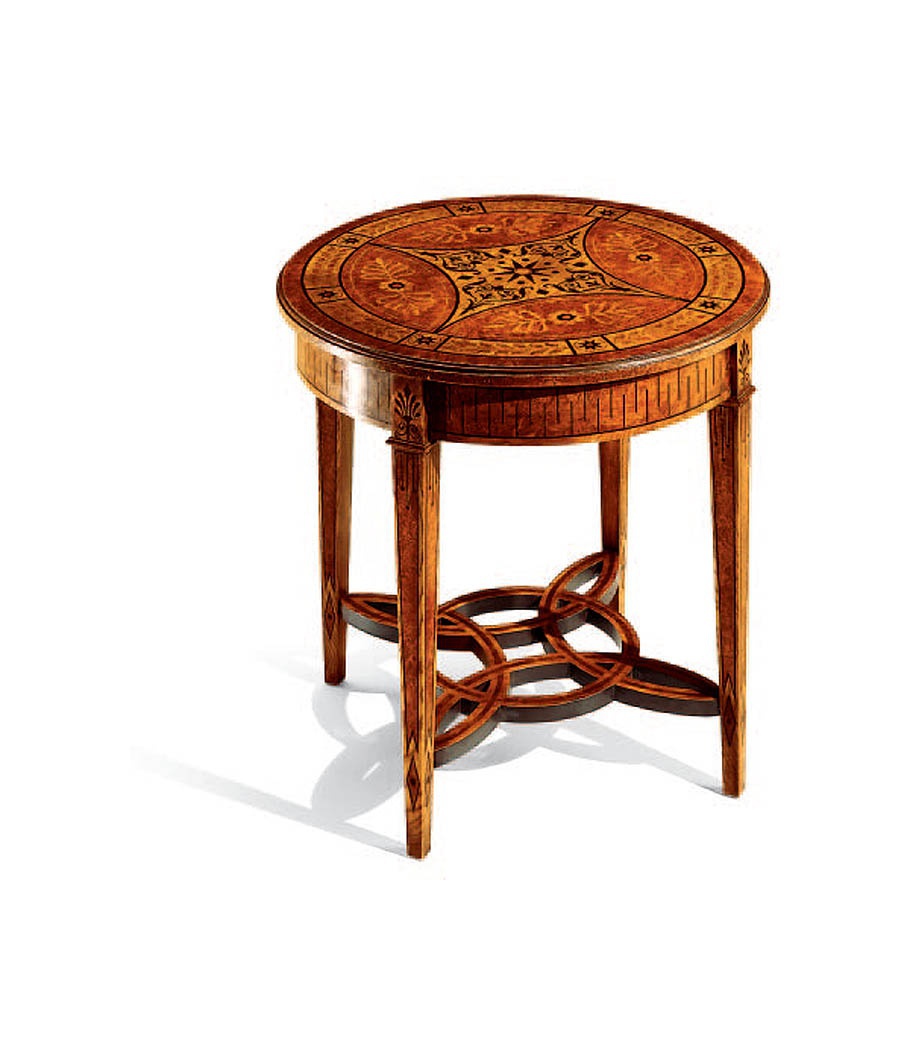 Round coffee table from the Italian manufacturer Armando Rho. The model is made from solid dark wood in the finishing varnish, with decorative inlays of mahogany. Carving done by hand. A great choice for the interior in classic style. Colours in stock.