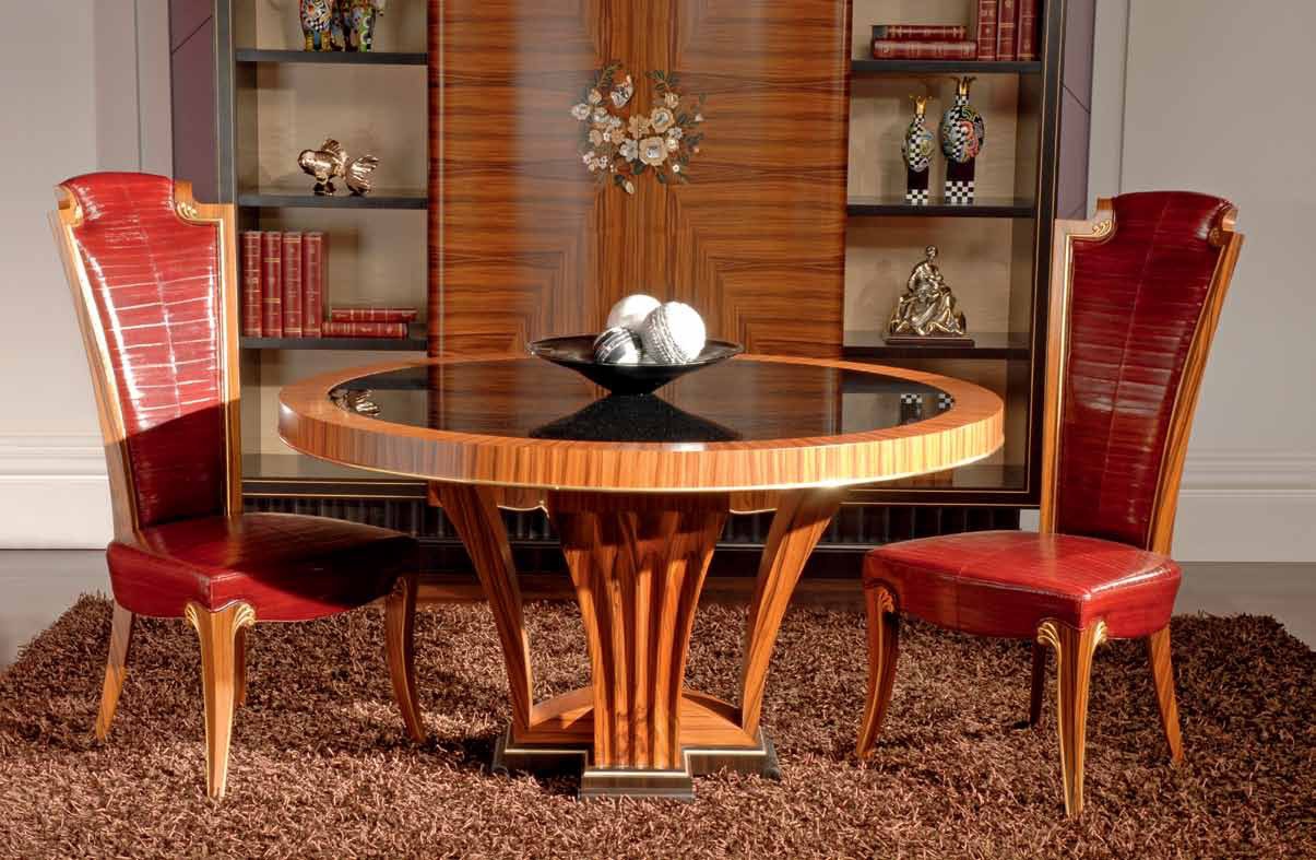 Set for the dining room of the Italian manufacturer Zanaboni. The presented model of the round table and chairs in leather upholstery with high backs. Table with solid top and original stem. Color combination in brown tones of wood and red upholstered chairs. A modern solution for the interior of the dining room.