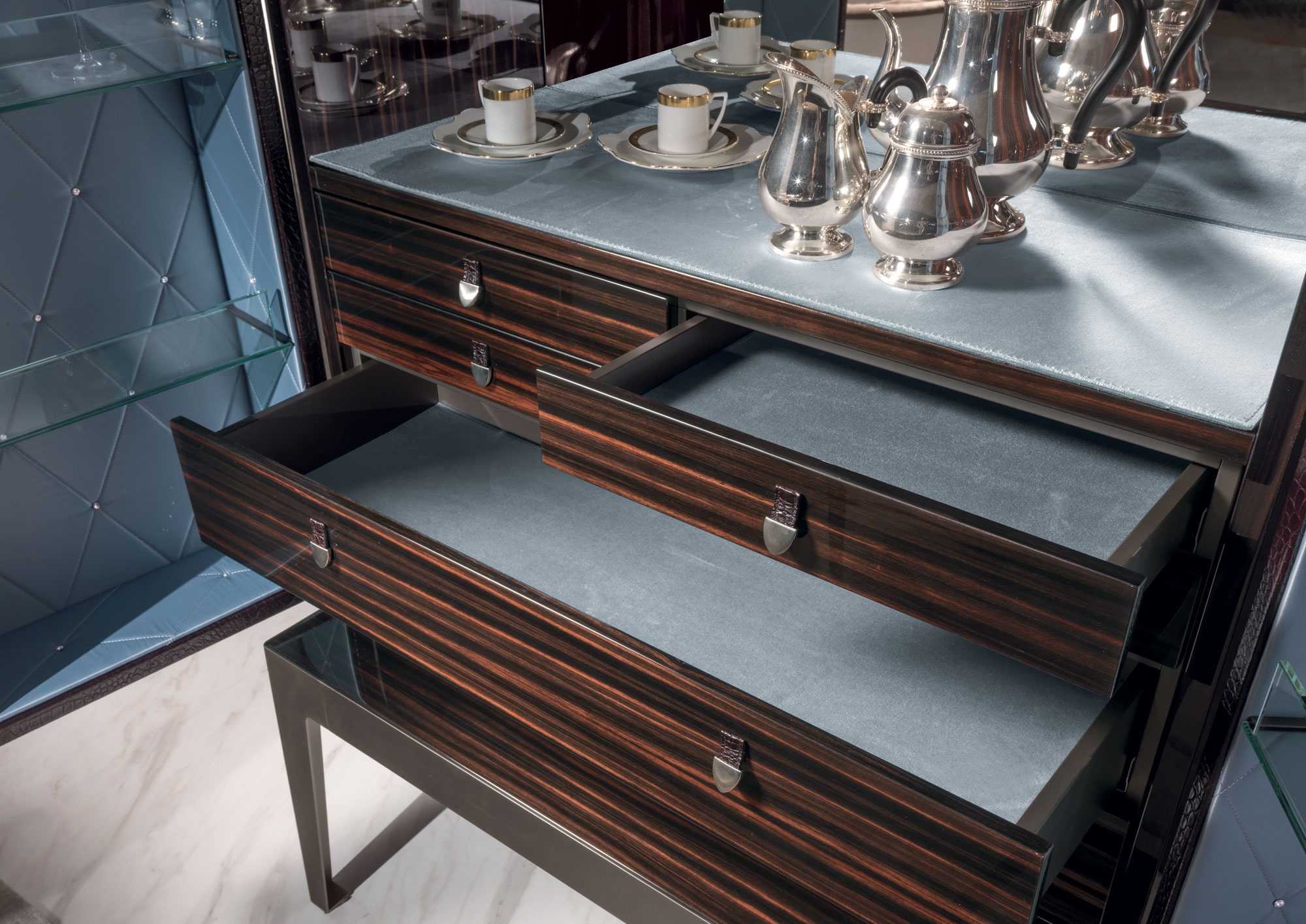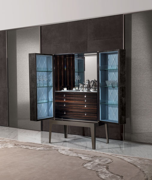 The rack bar Grandeur Evo from the Italian manufacturer Longhi. High wooden Cabinet with doors, container tighted the skin according to the catalog and internal elements, upholstered in satin or velvet with firmware in the form of a rhombus with buttons “Swarovski”. Shelf: transparent glass handle: leather. Central Cabinet with a Cabinet with 6 drawers, the bottom is velvet. An open niche with a mirrored base with led light. On request support for the version of the Shoe Cabinet. Cabinet finish: glossy ebony, glossy Canaletto walnut, Matt ebony, Matt Canaletto walnut, glossy lacquer in ivory, Matt wenge.
