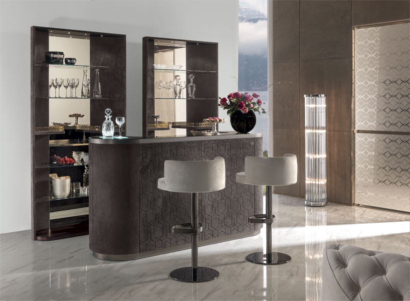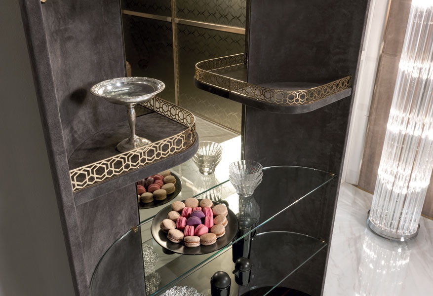 Showcase Hennesy from the Italian manufacturer Longhi. Outdoor display cases. The sides of bent wood covered with skin according to the catalog. The Central part of a bronze or smoky mirror. Shaped shelves in transparent glass 8 mm. Trays covered with skin, are laser metal edging decor