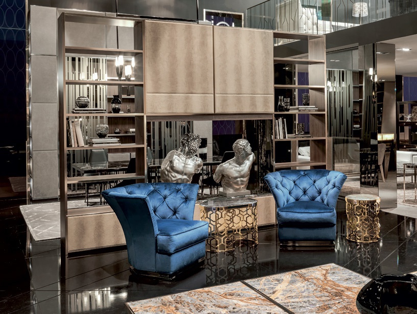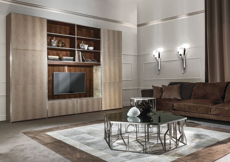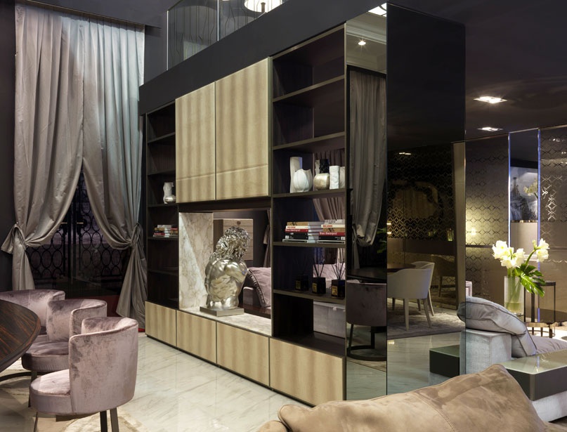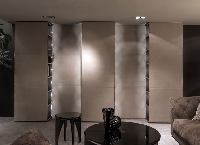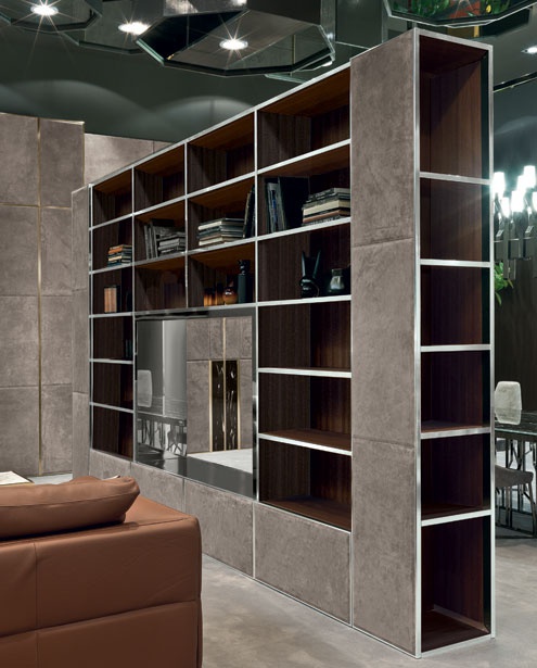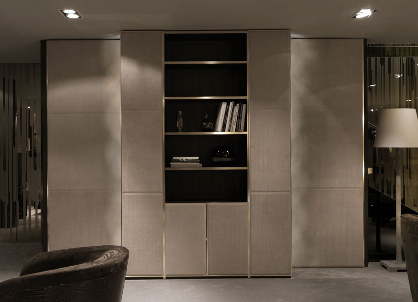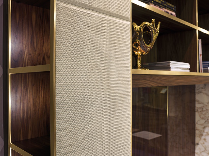Modular system Ianus Middle from the Italian manufacturer Longhi. Modular system equipped wall panels, including open elements, drawers, shelves and doors that perfectly complement the modular nature of the boiserie and the Ianus doors. All modules are provided in the form of dividing walls or furniture. Frame: zebrawood,tinted in dark colour or Canaletto walnut with a matte finish (only the backrest can be made to order with a glossy finish). All profiles: glossy light gold, natural polished brown and shiny. Doors and front panels upholstered with beveled corners with a "diamond" and ideally combined with doors and boiserie panels Ianus. Inside of end items (T-U) on request can be installed led lighting. Structure: Wood with veneer of zebrawood dark colour or Canaletto walnut with a matte finish. Facing the front, flaps and drawers: the skin according to the samples in the catalog, the Cristal Rain mirror or smoked bronze mirror, bronze or smoky etched mirror, - bronze or smoky. Aluminium profiles: natural polished, shiny gold, Matt satined bronze, brown shiny.