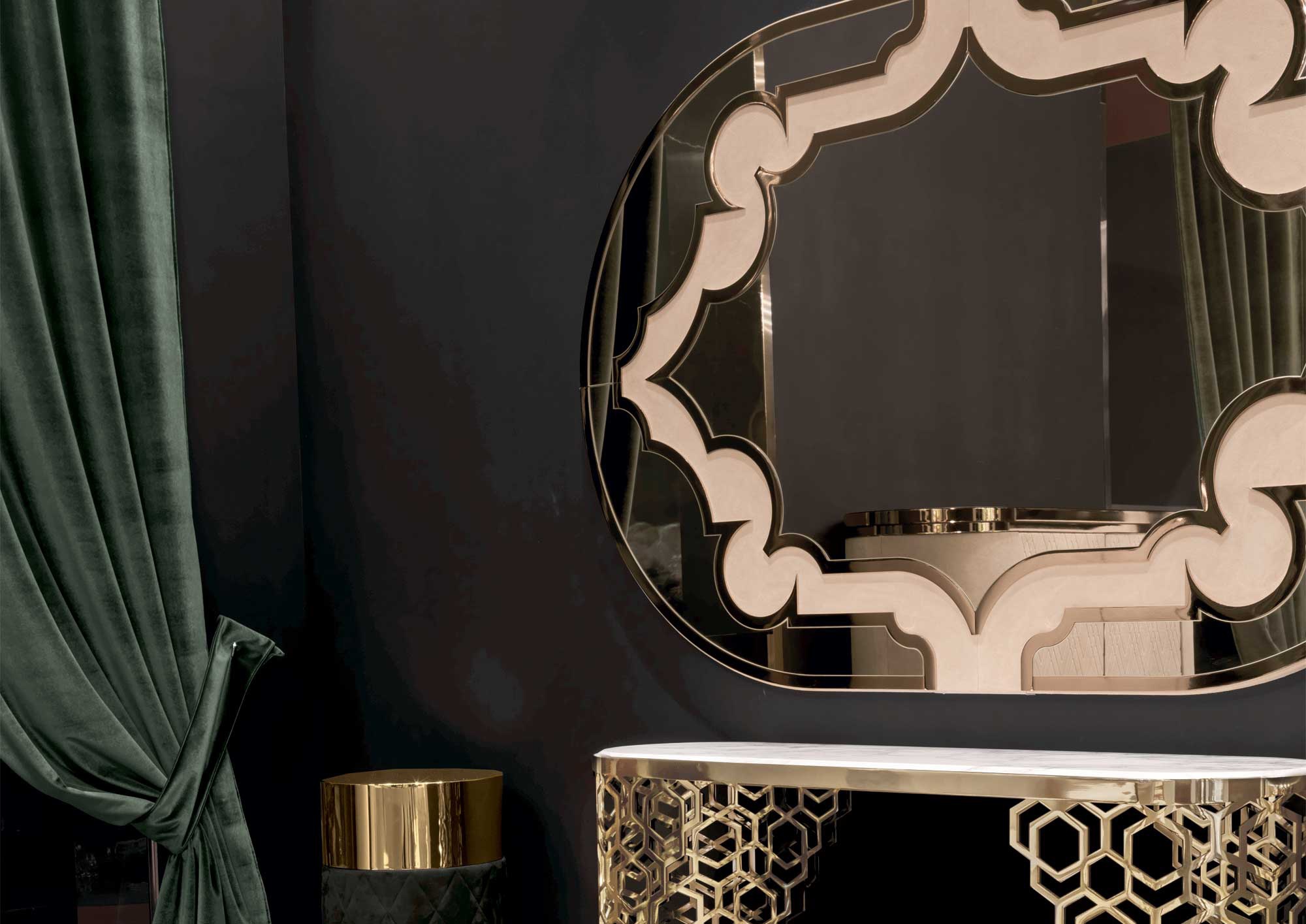 Wall mirror Byron from the Italian manufacturer Longhi. Frame of polished metal finishes: glossy light gold, glossy chrome, black glossy chrome, Matt satined bronze. Edging and interior decoration are covered with leather P. 3 cat. Suede. The model is made in a modern style, combines tradition and design.