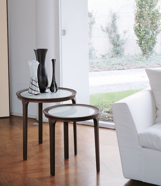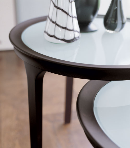 Regent coffee table from the Italian manufacturer Longhi. Collection of round coffee tables with frames made of solid wood and top made of glass with sand blasting. Finish - dark oak. The model is made in a modern style, combines tradition and design.