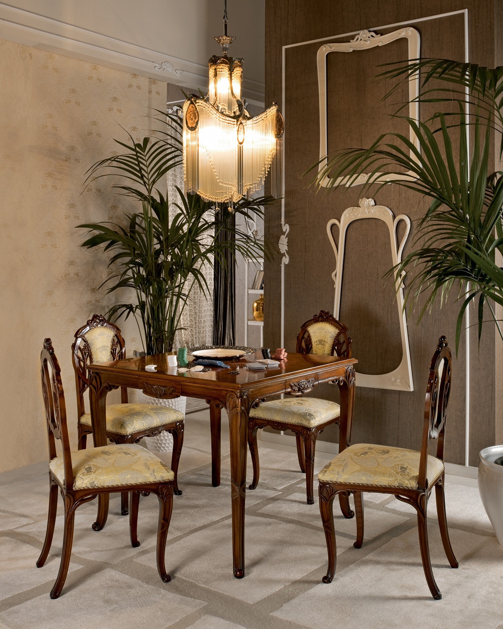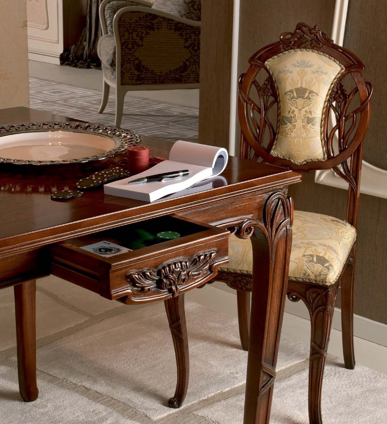 Set for the dining room Liberty from the Italian manufacturer Medea. Set consists of dining table and chairs. Furniture made of natural wood, decorated with carved handmade decor and varnished. Table with square table top, perfect for Board games such as cards. Chairs without armrests with soft padding.