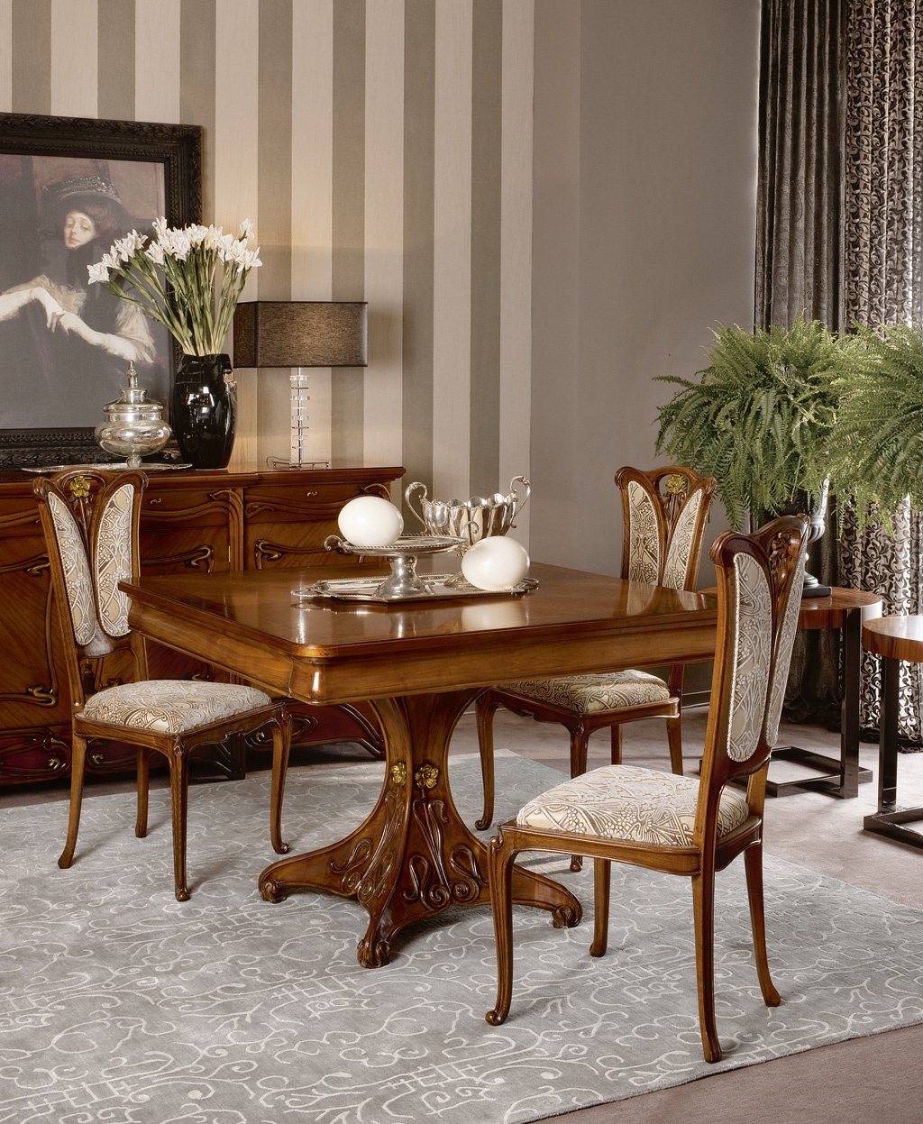 Set for the dining room Liberty from the Italian manufacturer Medea. Set consists of dining table and chairs with upholstery. Furniture made of natural wood, decorated with carved handmade decor and varnished. Table with sliding table top figure on the pole. Chairs with high back, without armrests. Colors of upholstery in stock.