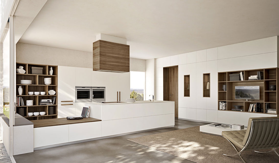 Set for the kitchen Essentia from the Italian manufacturer MOD'...ART. Consists of island work area, cupboard for built-in appliances, shelving, hoods. The building, the facades are made of solid wood. Top working area is made of white marble. The facade of the treated cabinets white high gloss lacquer finish. Presented headset colors: natural wood, white. It is important to note that lacquer, marble, wood - based on manufacturer's catalogue.