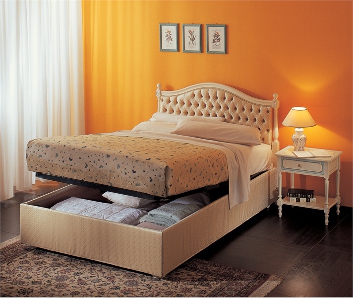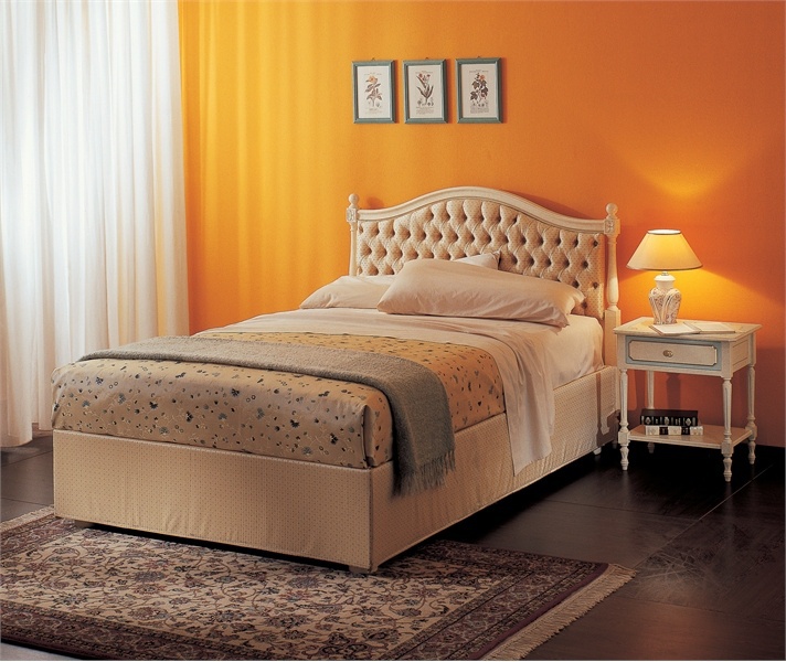The Matrimoniale bed from Italian manufacturer Pellegattа. The hand-crafted bed. Single or double bed with box for linen and without. High headboard carved wood frame complemented with a soft insert in the textile upholstery with decorative stitch Capito. Shell and base are made of solid wood covered with textile. All finishing is performed manually.