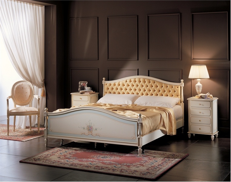 The Matrimoniale bed from Italian manufacturer Pellegatta. High headboard carved wood frame complemented with a soft insert in the textile upholstery with decorative stitch Capito. All finishing is performed manually. Color maybe in white or pink versions.