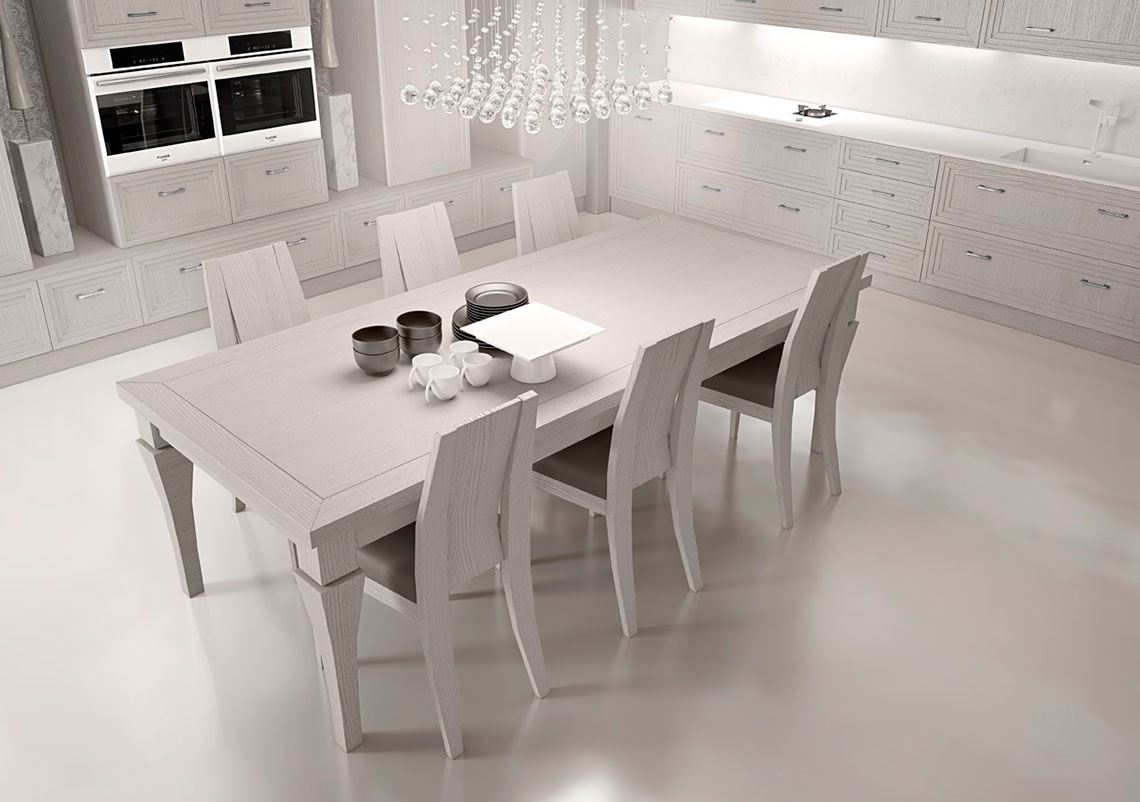 Set for your dining Surface from Italian manufacturer MOD'...ART. Set consists of rectangular dining table on figured legs, chairs with upholstered seat and high back. Body, table top and legs made from solid wood. Coating - matte varnish, water-based, with visible structure of wood. Set concise form presented in white colour. It is important to note that the wood texture and the color palette is based on the number of items.