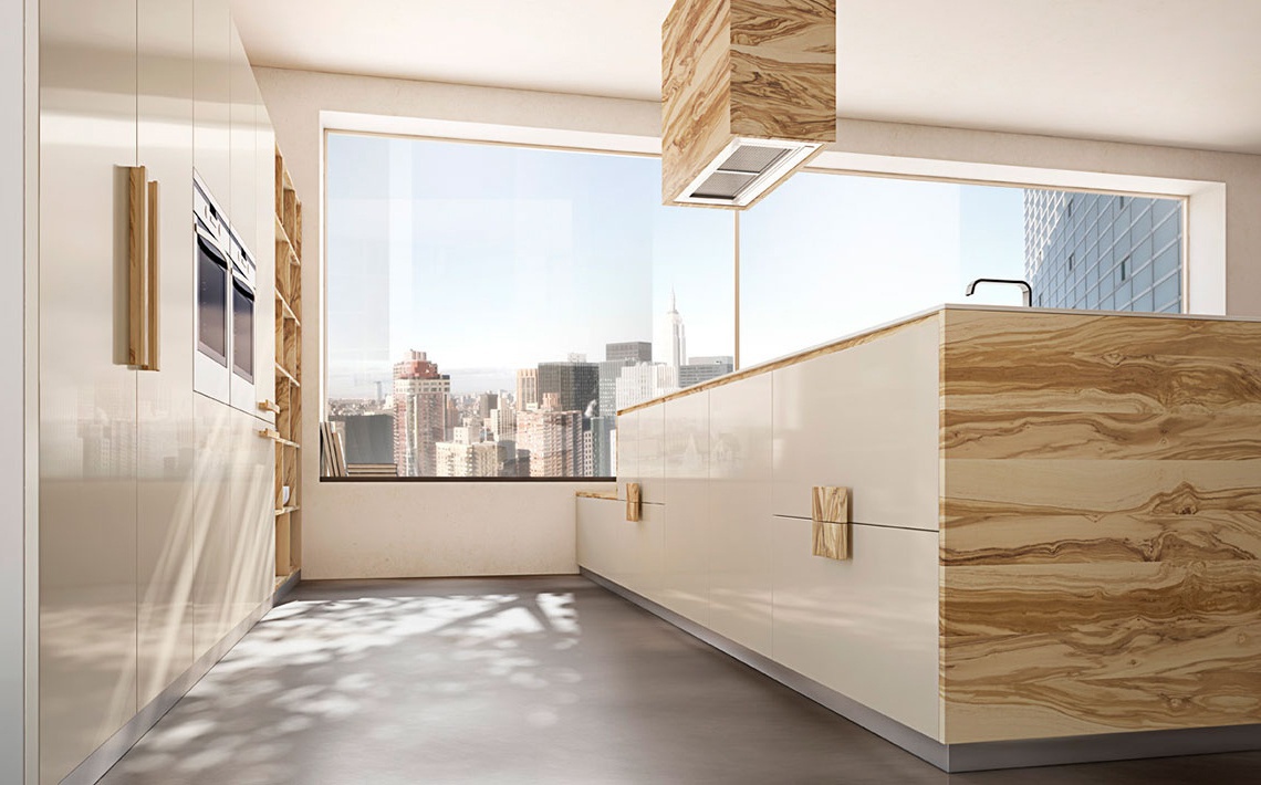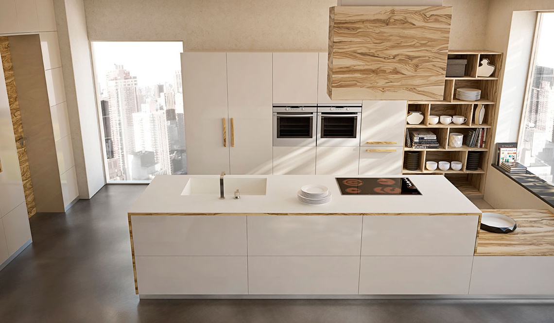 Set for the kitchen Essentia from the Italian manufacturer MOD'...ART. Consists of island work area, cupboard for built-in appliances, shelving, hoods. The building, the facades are made of solid wood. Top of the working area is represented in white marble. The facade of the treated cabinets white high gloss lacquer finish. Partially saved by a clear structure of natural wood, eco-style softening strict minimalism. Presented headset colors: natural wood, white. It is important to note that the customer can choose a varnish, type of wood in stock.