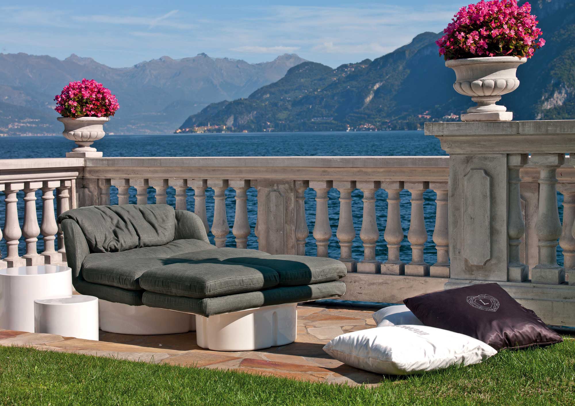 Set for street Dolcevita from the Italian manufacturer Longhi. The structure of the optical fiber. Loose cushions in foam and Dacron, fully removable. Upholstery - textiles. Colours: glossy white, glossy black. Metal: bronze, grey, blue.