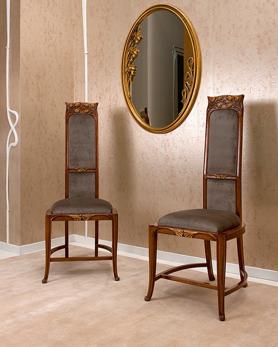 The Liberty chair from the Italian manufacturer Medea. The model without armrests, with a high narrow back. The frame is made from wood and decorated with carved decoration and gilding. The upholstery is made of textile fabric grey or catalog company.