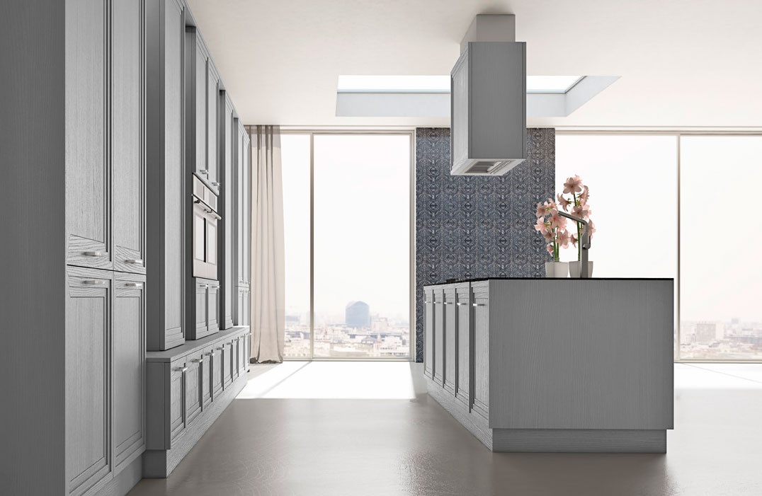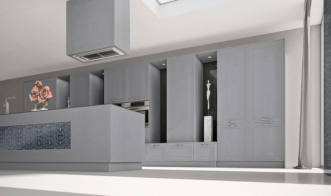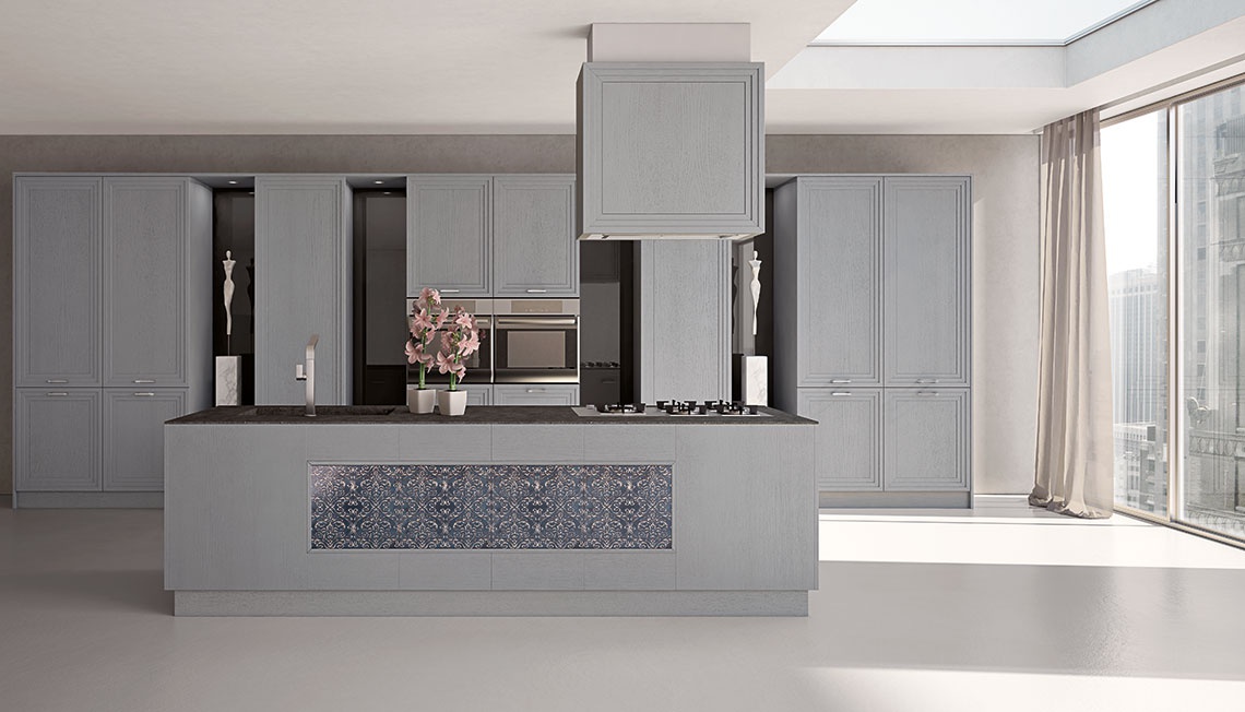 Set for the kitchen Surface from Italian manufacturer MOD'...ART. Set consists of a Cabinet for built-in appliances, hoods, cabinets-island, are equipped with lower storage space, working surface of stone and ceramic hob. Building, facade made from solid wood. Finish - matte water-based paint in shades of grey. The accessories are made of stainless steel. Brightness concise manner the set provides decorative ceramic masonry with complex ornament. It is worth noting that the colors, ceramics - based on the number of items.