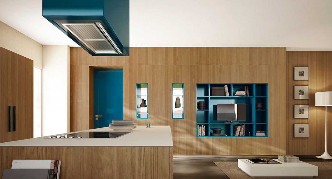 Set for the kitchen Essentia from the Italian manufacturer MOD'...ART. Consists of island working area with a hob, cupboard for built-in appliances, shelving, hoods. Building, facade made from solid wood. The surface is partially painted in a turquoise color, combined with natural wood, minimalist style headset acquires notes of Mediterranean chic. Top working area is made of stone. Color set, wood, stone - not on the number of items.