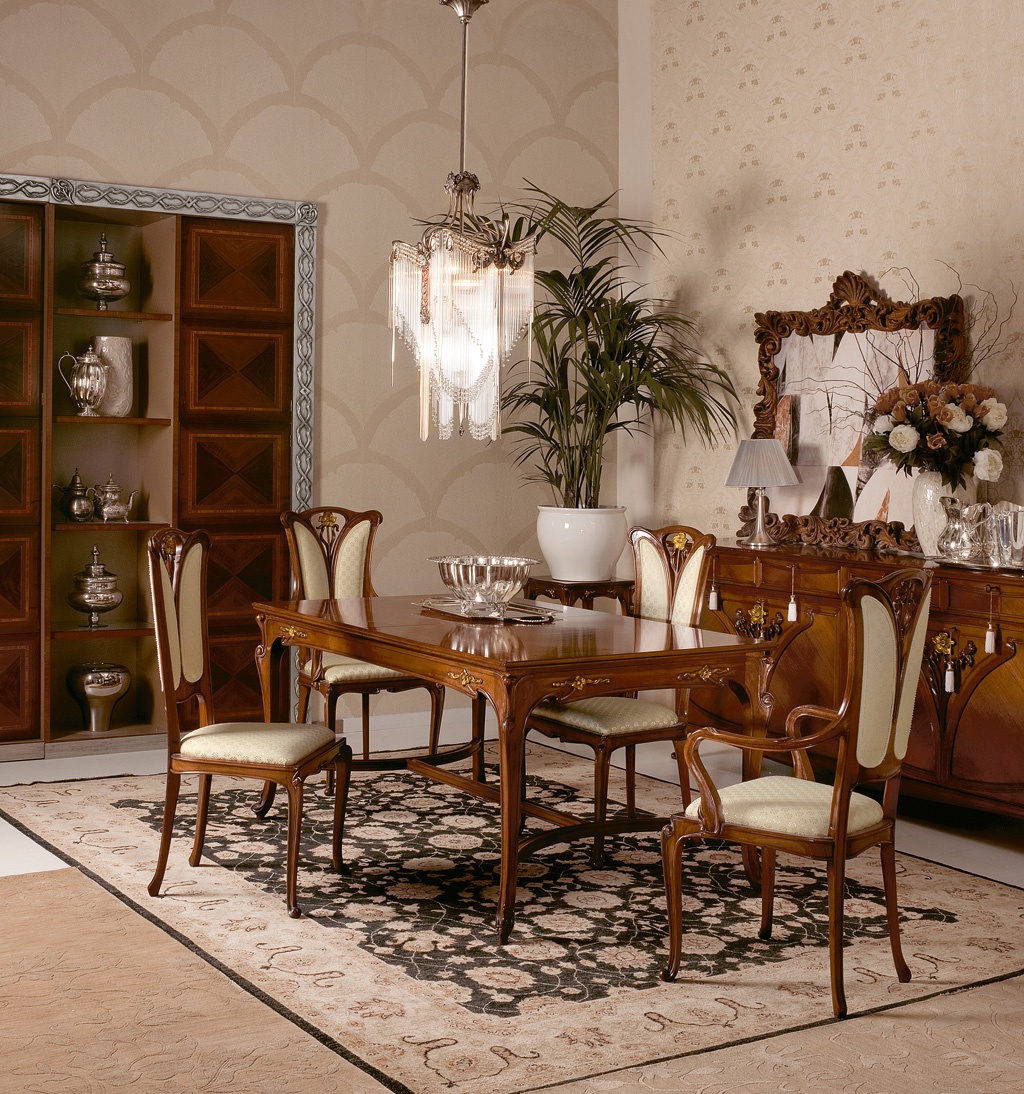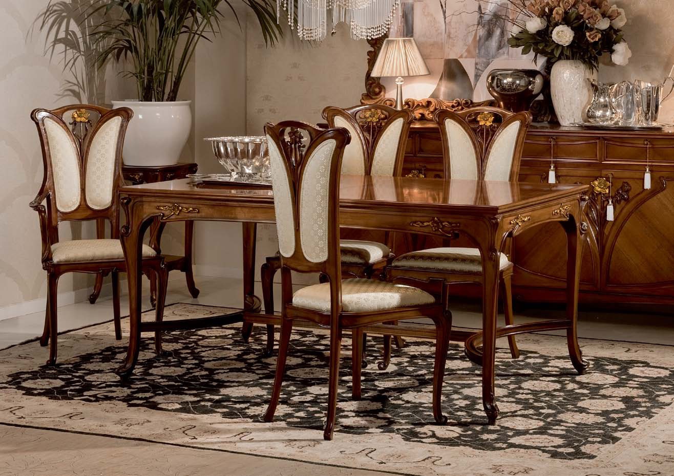 Set for the dining room Liberty from the Italian manufacturer Medea. Set consists of dining table and chairs. Furniture made of natural wood, decorated with carved handmade decor and gold-plated elements. Finishing varnish. Desk with sliding top. Chairs with or without armrests, upholstered light color.