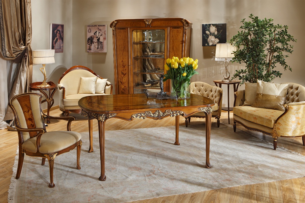 The Liberty table from the Italian manufacturer Medea. The manufacturer offers an extendable table for dining room or living room. The frame is made from wood and decorated with carved decoration and gilding. Wooden table top decorated with inlaid.