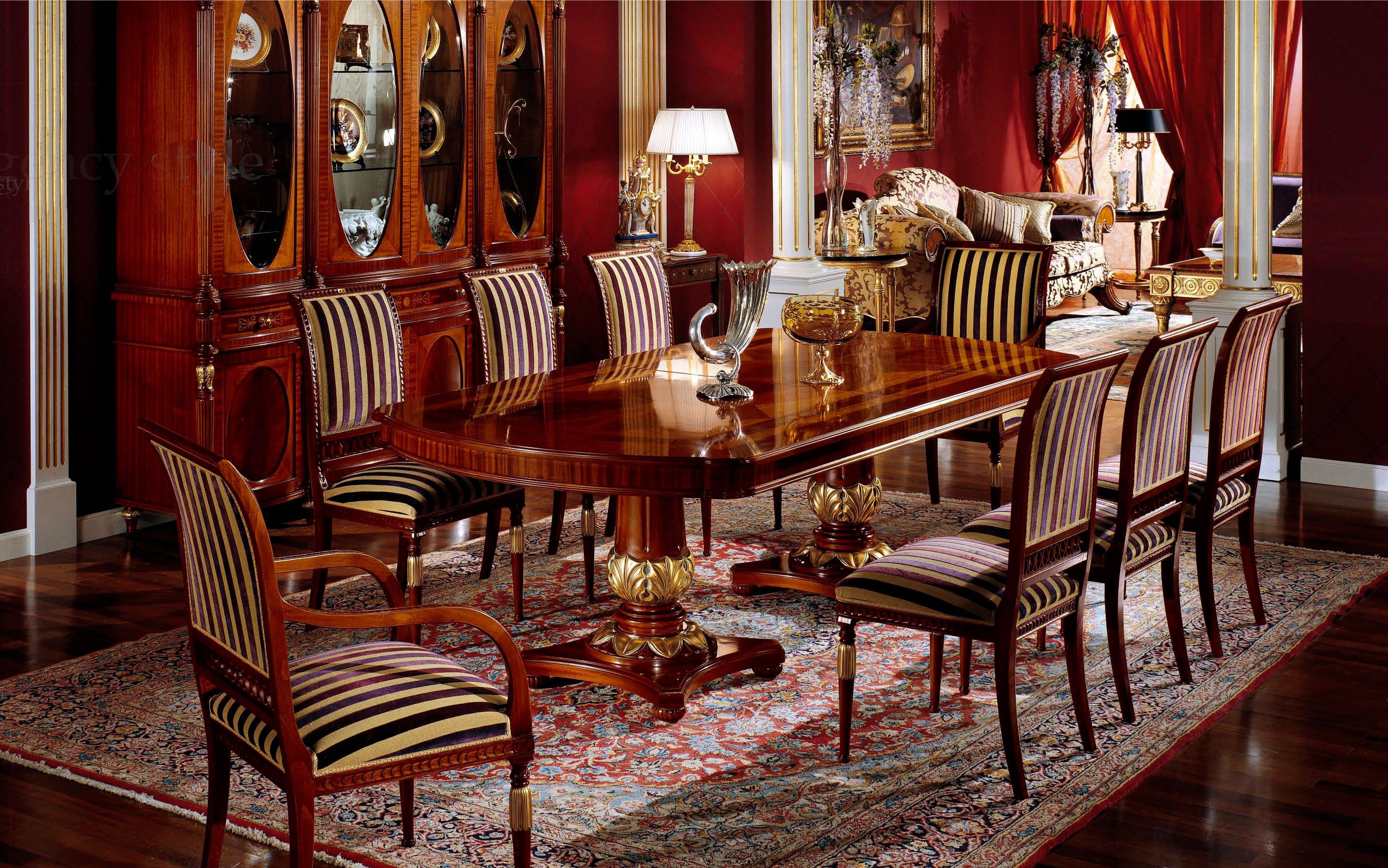 Folding dining table from Italian producer Armando Rho. The model is made from solid wood with decorative inlays of mahogany. Curved legs and an architrave decorated with handmade carving. Finish -gold leaf. Colours in stock.