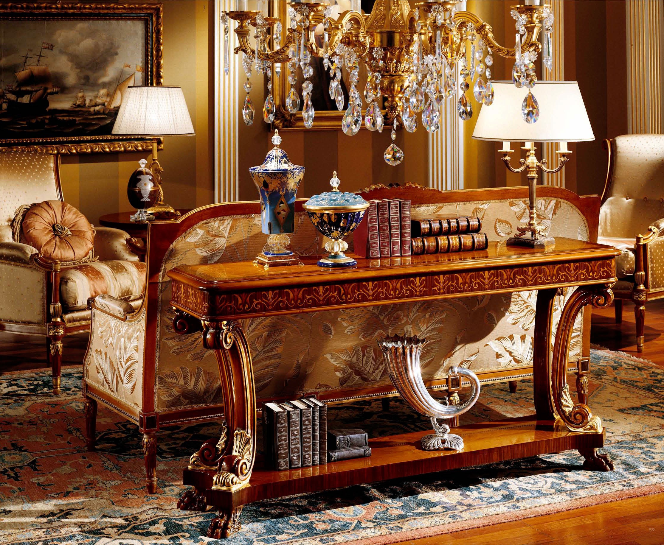 Pridivanny table from the Italian manufacturer Armando Rho. The model is made from solid mahogany. Inlaid maple, walnut, Tulip tree. Curved legs and an architrave decorated with handmade carving. Finish -gold leaf. Colours in stock.
