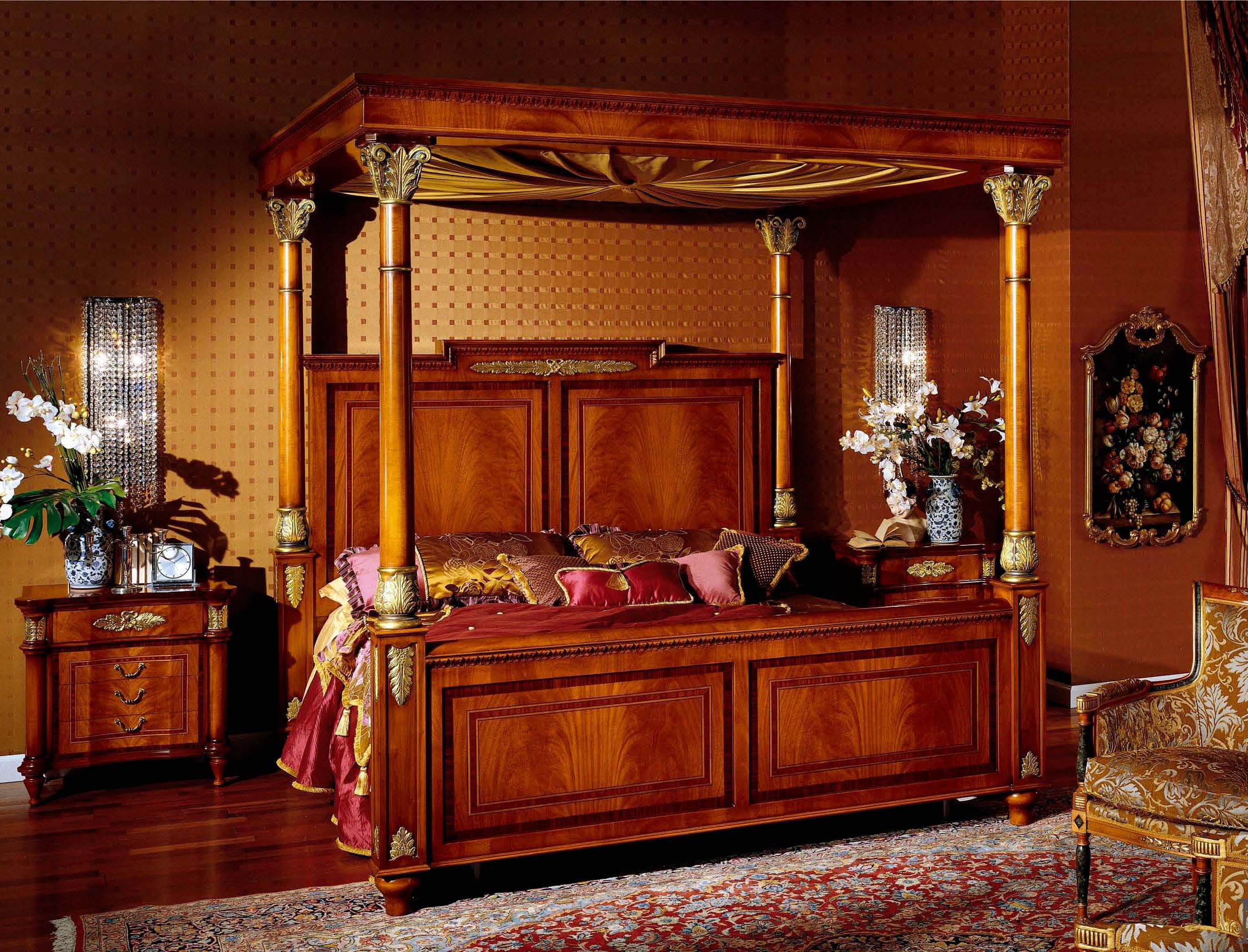 Double canopy bed from Italian manufacturer Armando Rho. The model is made from solid mahogany. Inlaid maple, walnut, Tulip tree. The bed is decorated with handmade carving. Finish -gold leaf. Colours in stock.