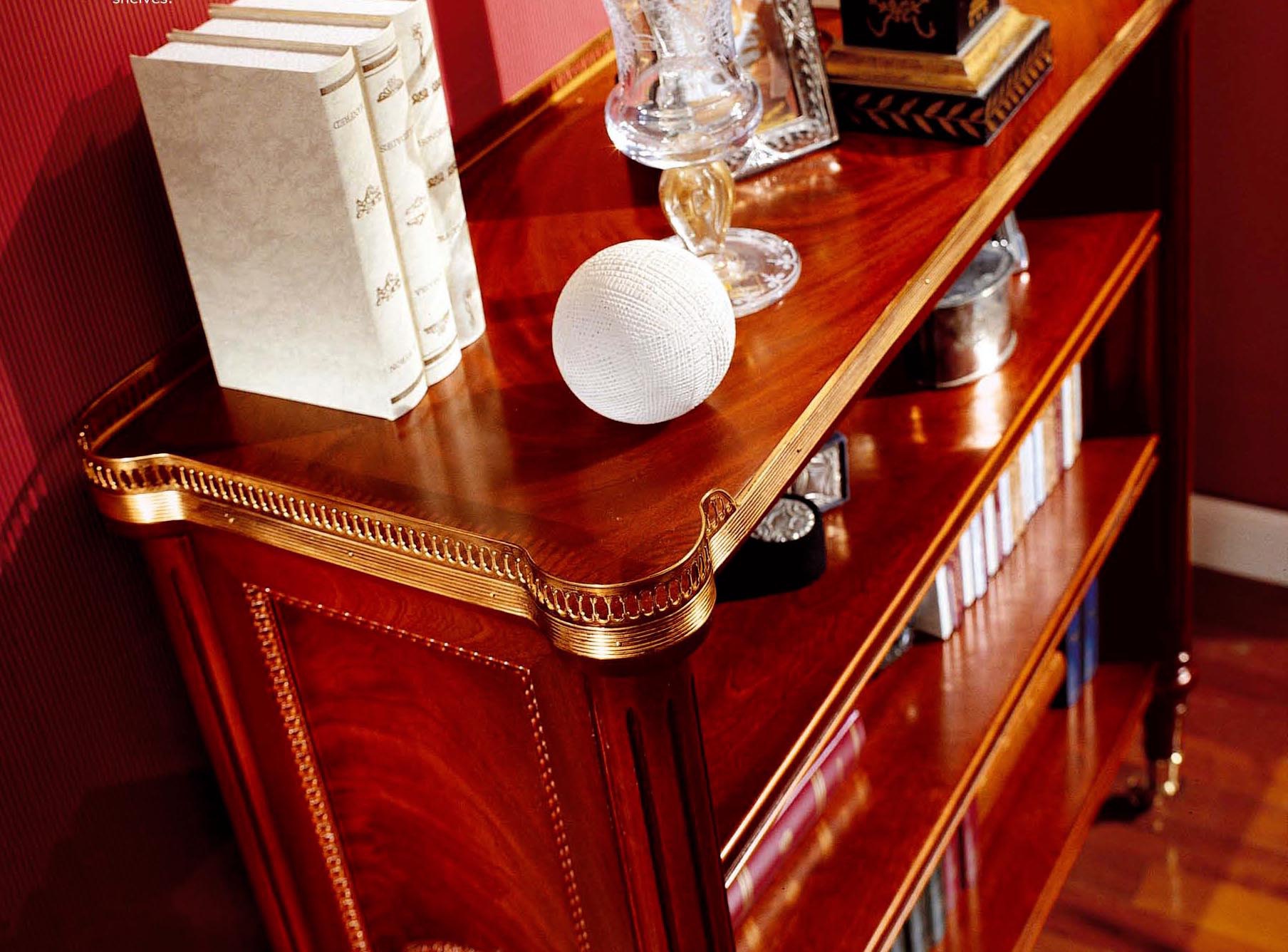 Bookcase from Italian producer Armando Rho. Frame made of solid wood. Inlay is maple, the Tulip tree. The model is decorated with handmade carving. Finish -gold leaf. Colours in stock.
