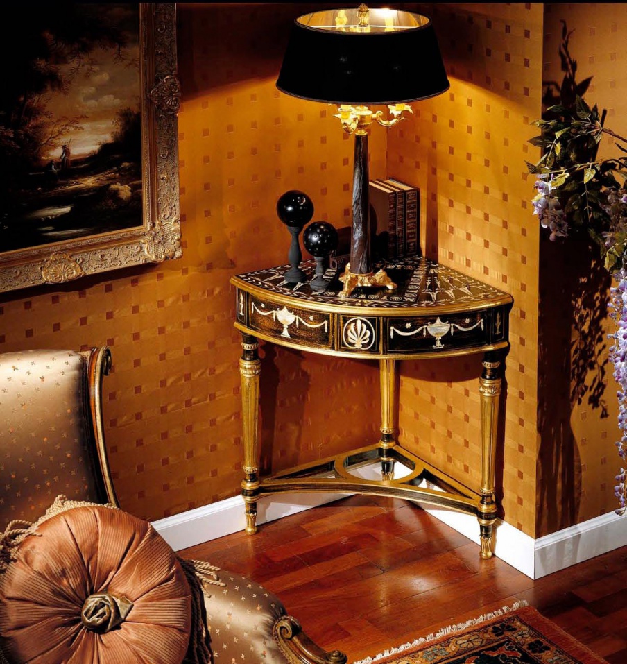 Corner table from the Italian manufacturer Armando Rho. The model is made from solid wood. Thread - handmade, decorated with lacquer, gold leaf. Colours in stock.