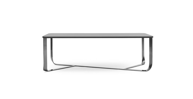 The Confluence table from the Italian manufacturer Pianca. Made of steel frame and durable worktops from oak veneer. Design solution of the intertwining of the legs, creating the effect of levitation. Desk created for interior in modern style. Color catalog of the manufacturer, the model presented in chrome and matte processing.