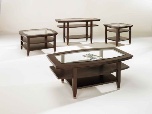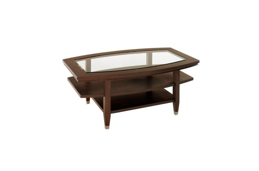 Northern coffee table from American Furniture manufacturer Broyhill. Oval coffee table clear reflects the modern point of view on interior design living room. Frame, legs and shelf table made of dark walnut with a multi-stage finish that beautifies and protects the product. Radiant glass top is visually displaces the construction of the lower shelves. Table legs metal shod in clogs.