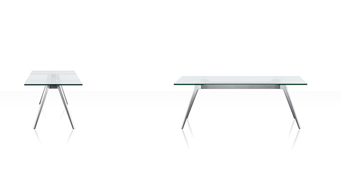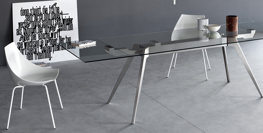 The Delta table from the Italian manufacturer Pianca. Made of steel frame and glass table top, wooden base possible. The sliding table is of contemporary style. Available in various color options and types of processing.