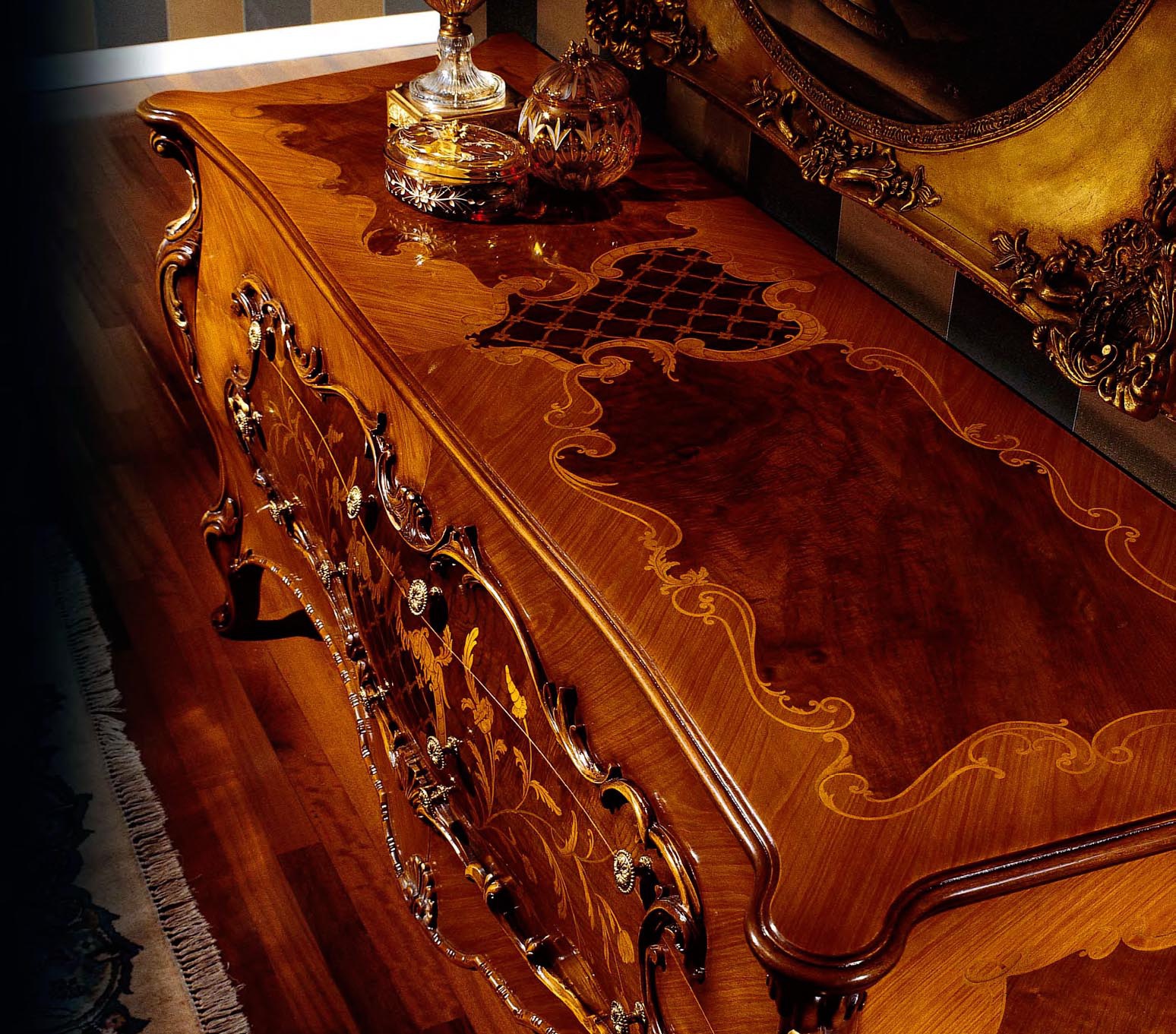 A chest of drawers from the Italian producer Armando Rho. The model is made from solid mahogany wood finishing lacquer, inlay, combination of different kinds of wood (solid maple, walnut, cherry, Tulip tree). Curved legs and an architrave decorated with hand-carved decor - gold leaf.