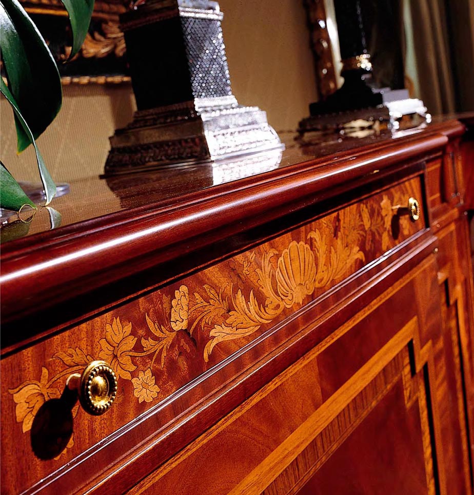 Stand from Italian manufacturer Armando Rho. The model is made from solid mahogany wood finishing lacquer, inlay, combination of different kinds of wood (solid maple, walnut, cherry, Tulip tree). Curved legs and an architrave decorated with hand-carved decor - gold leaf. Colours in stock.