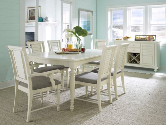 Dining table Seabroke from the American manufacturer Broyhill Furniture. Rectangular dining table inspired by the style of Provence, is the ideal choice for the living room of a country house and give all the air atmosphere the charm of the French countryside. The table is made from wood of larch and birch veneer finished; creamy white high gloss finish will ensure many years of service of the product. Carved legs, folding table top, with a decorative apron.